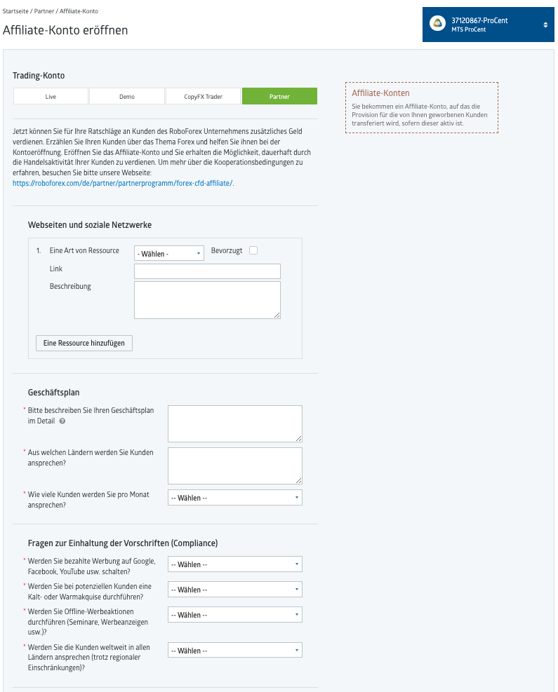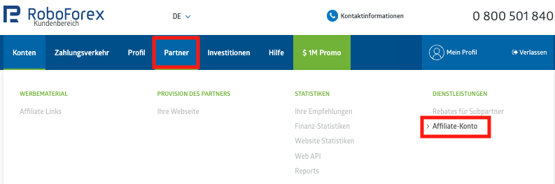 - Klicken Sie im Dropdown-Menü der Registerkarte "Partner" auf "Affiliate-Konto".
