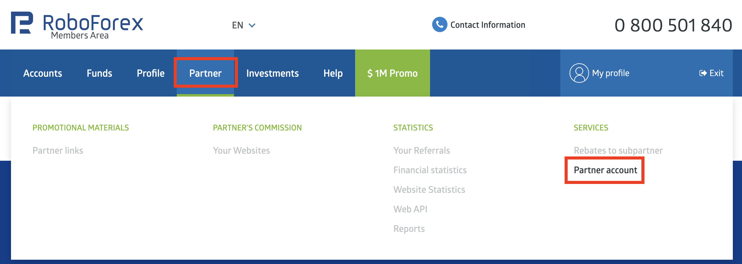 - In the dropdown menu of the "Partner" tab click on "Partner account".