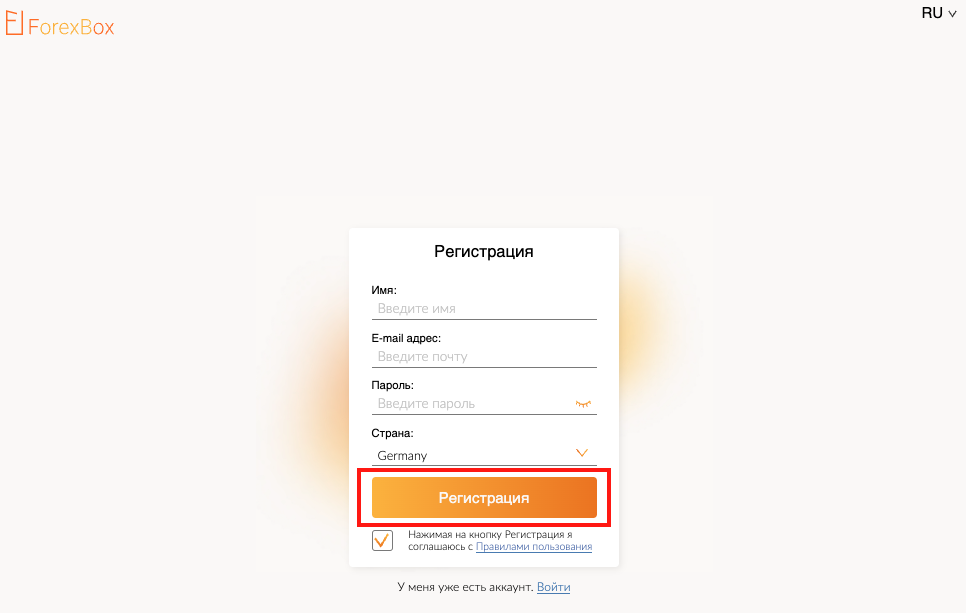 - Перейдите на сайт https://my.forex-box.com/register.php