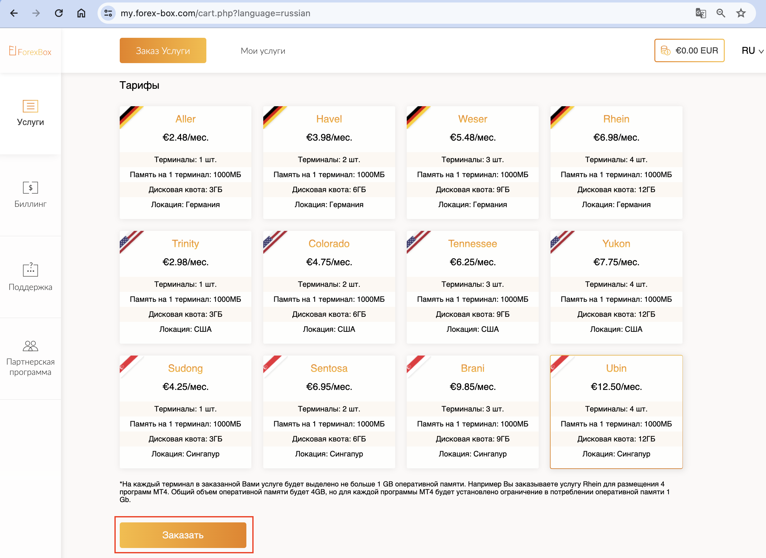 Выберите один из тарифных планов для удаленного рабочего стола и нажмите кнопку "Заказать".