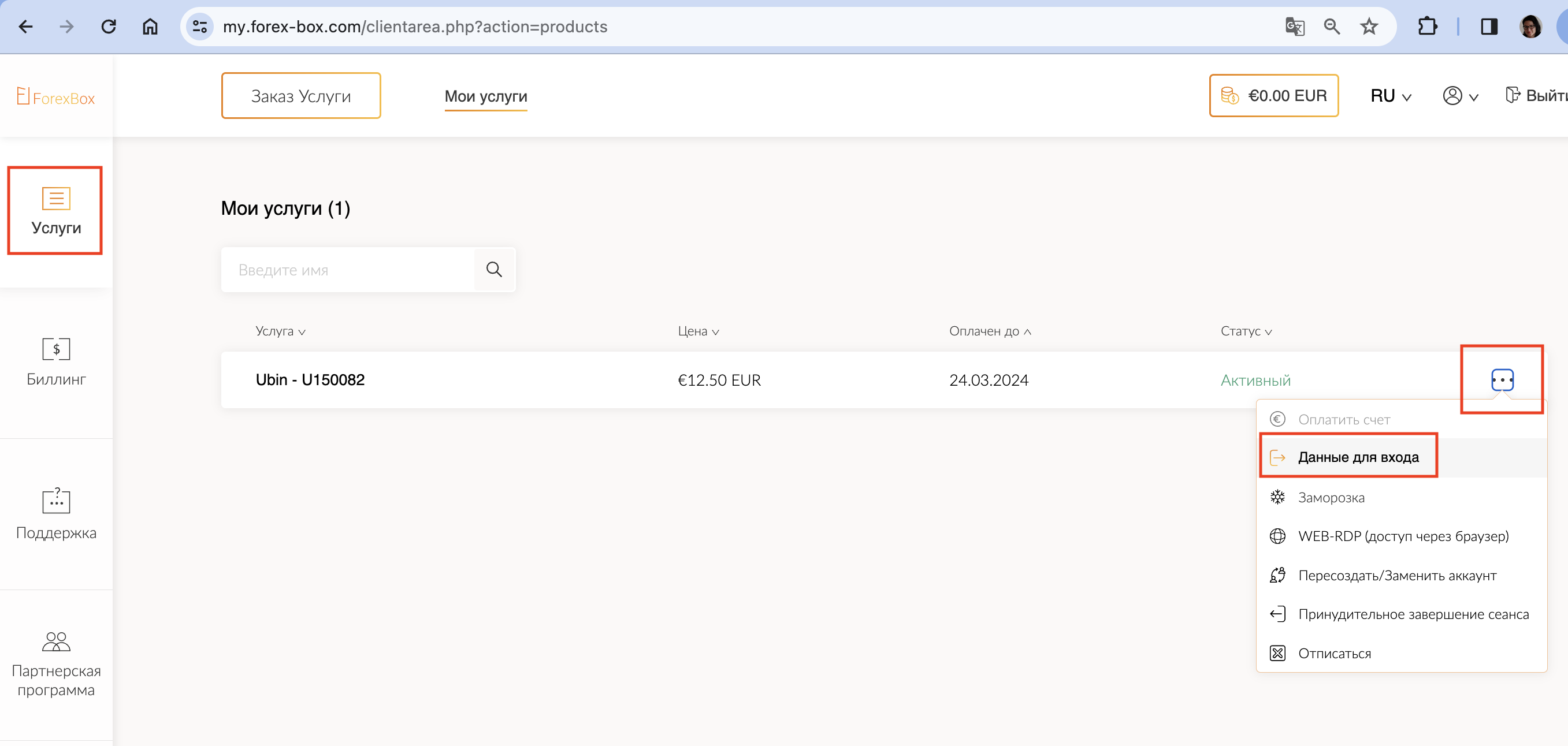 - Перейдите во вкладку "Услуги" в левой панели меню.